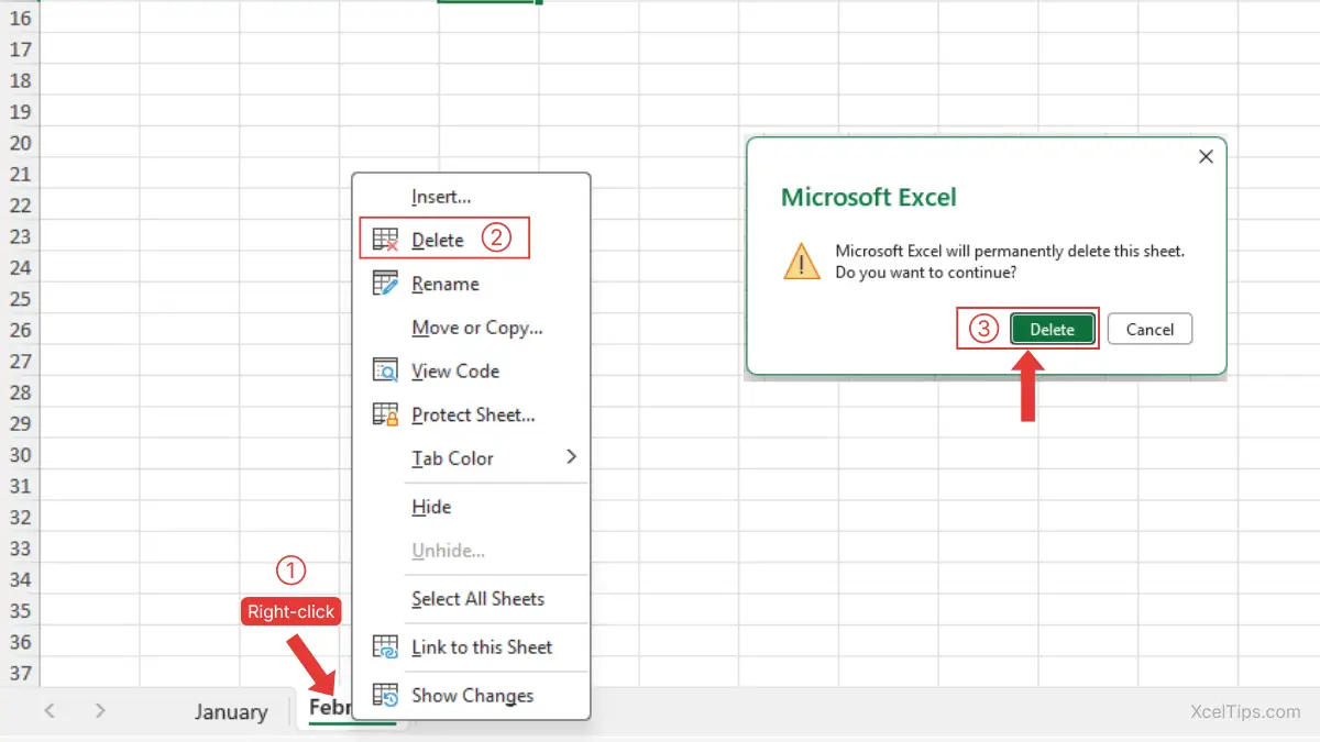 - Click Delete. If the sheet contains data, Excel will show a warning message.