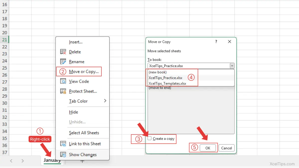 In the dialog box, select the target workbook, check Create a copy, and click OK.