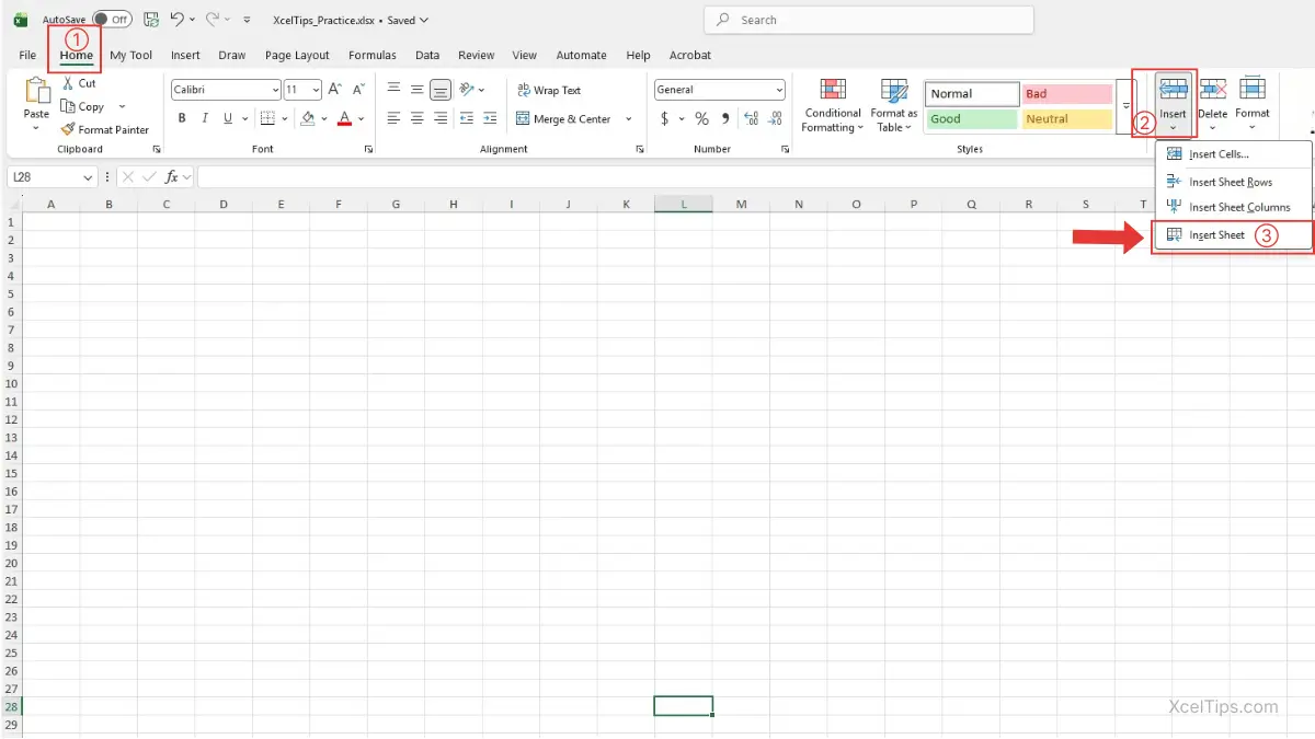 The Home → Insert → Insert Sheet method is useful when you are getting more comfortable with Ribbon commands.
