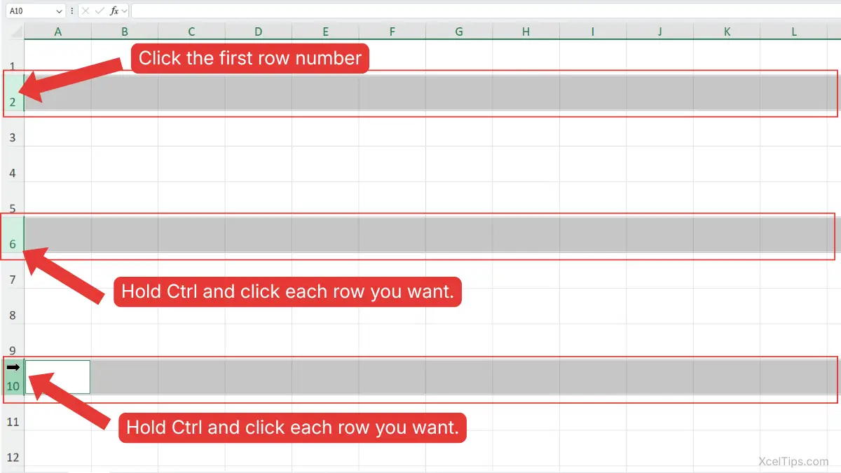 - To select different rows that are not next to each other, hold Ctrl while clicking each row number.