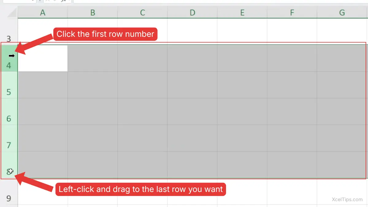 For example, dragging from row 4 to row 8 selects rows 4, 5, 6, 7, and 8.