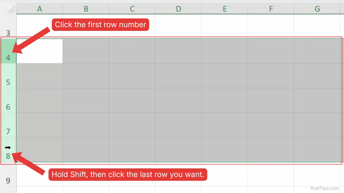 For example, if you click row 4, hold Shift, and click row 8, Excel selects rows 4 through 8.