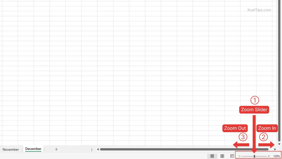 - Look at the bottom-right corner of the Excel window and find the zoom slider next to the zoom percentage.