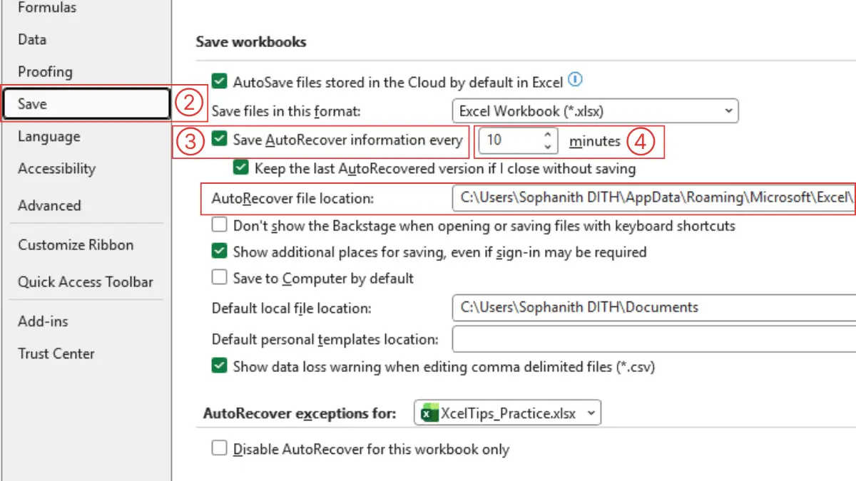 Excel Options Save settings showing AutoRecover file location and the Save AutoRecover information every minutes option.