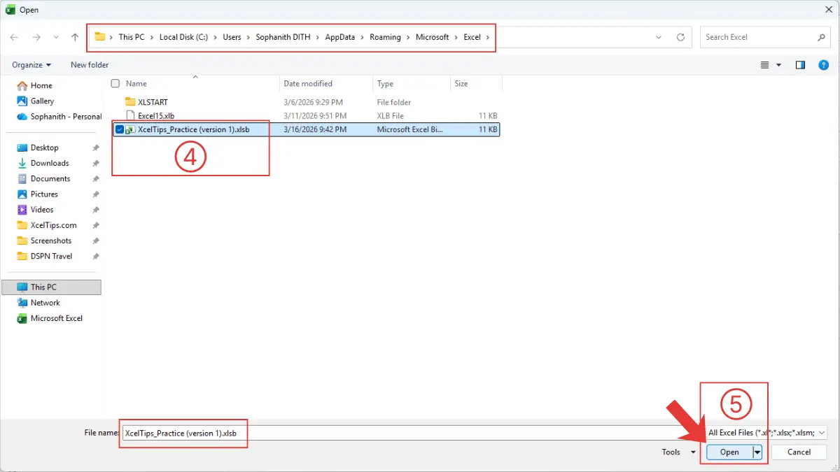 C:\Users\[YourName]\AppData\Roaming\Microsoft\Excel\