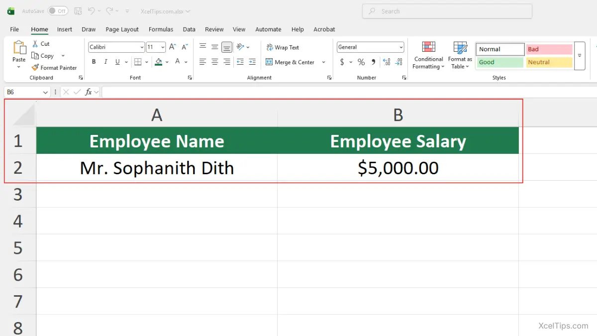 Screenshot of Excel worksheet showing cell A1 with Employee Name, A2 with Mr. Sophanith Dith, B1 with Employee Salary, and B2 with 5000 formatted as currency.