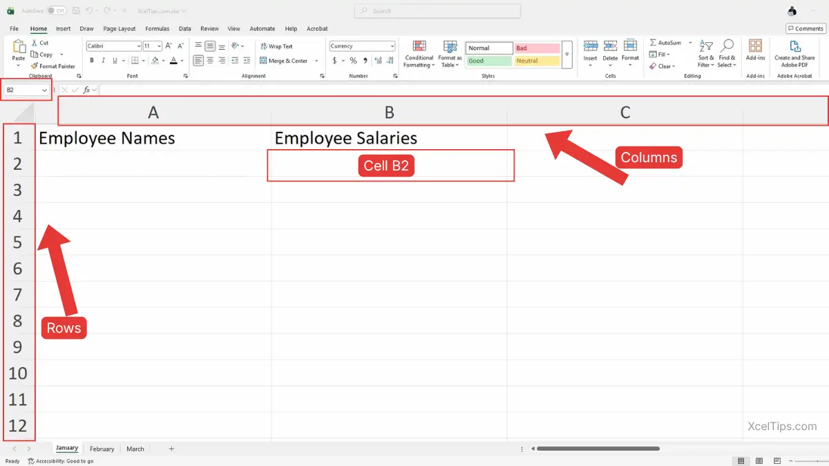 Once you’re inside a worksheet, Excel organizes everything using rows and columns, like a giant table.