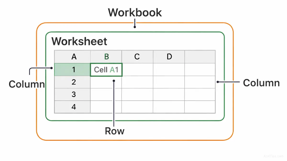 Diagram showing the relationship between an Excel workbook, worksheet, rows, columns, and a cell (A1).