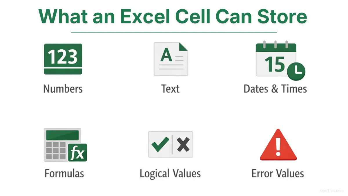 Infographic showing what an Excel cell can store, including numbers, text, dates and times, formulas, logical values, and error values.